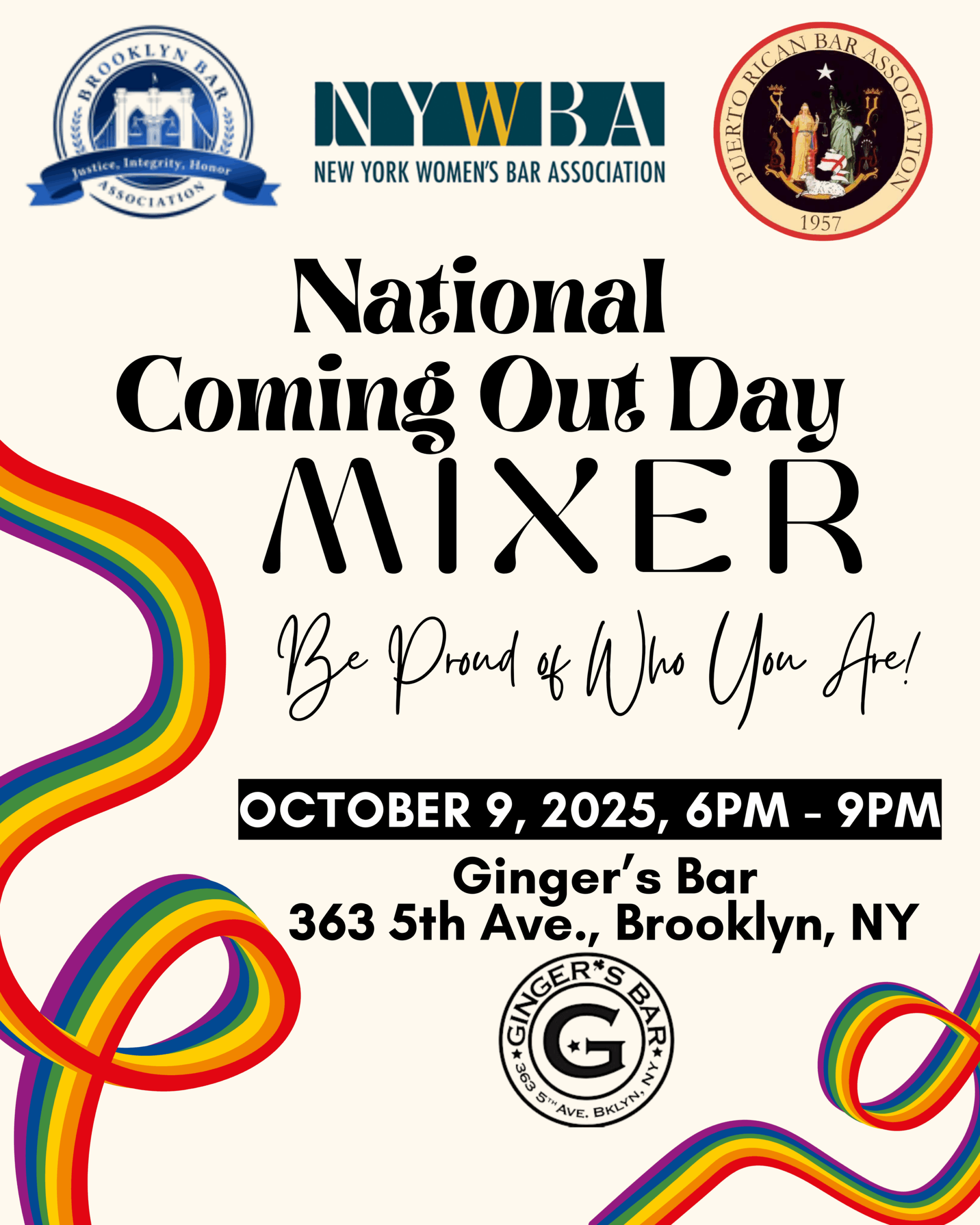 Join the Brehons at Ginger’s Bar in celebration of National Coming Out Day. Co-sponsored with Puerto Rican Bar Association, Brooklyn Bar Association and NY Women’s Bar Association.